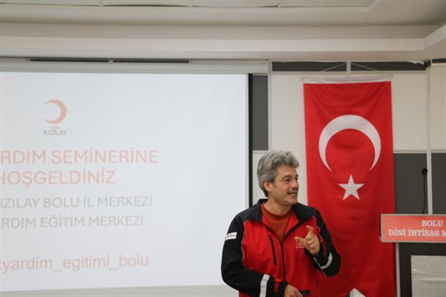 Bolu Dini İhtisas Merkezimizde III. Dönem Aday Din Görevlilerine yönelik Sosyal ve Kültürel etkinlik kapsamında 24.11.2025 tarihinde Türk Kızılay Bolu İl Başkanlığı İlk Yardım Eğitim Merkezi Mesul Müdürü ve Eğitmeni Kağan BALKIŞ tarafından İlk Yardım Eğitimi verildi. Eğitimde, acil durumlarda yapılması gereken temel ilk yardım uygulamaları ve heimlich manevrası anlatıldı. Kaza veya yaralanma anında yapılacak doğru müdahale yöntemlerini detaylı bir şekilde anlatan BALKIŞ, temel ilk yardım becerileri, bilinçlilik kontrolü, solunum yolu açma, kalp masajı, kan durdurma, yaraların temizlenmesi ve bandajlama, yanıklarda ve zehirlenme durumunda yapılması gereken ilk yardım konularında detaylı bir sunum gerçekleştirdi.